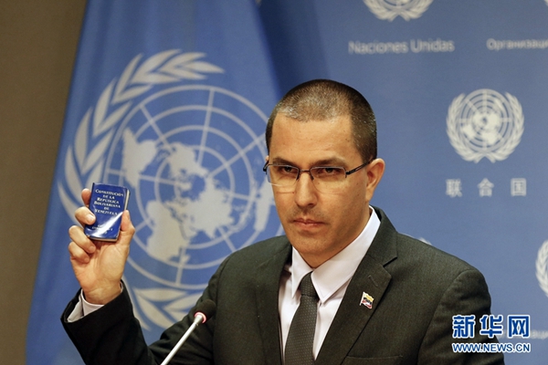 2月12日,在位于紐約的聯合國總部,委內瑞拉外交部長阿雷亞薩出席記者會。新華社記者 李木子 攝