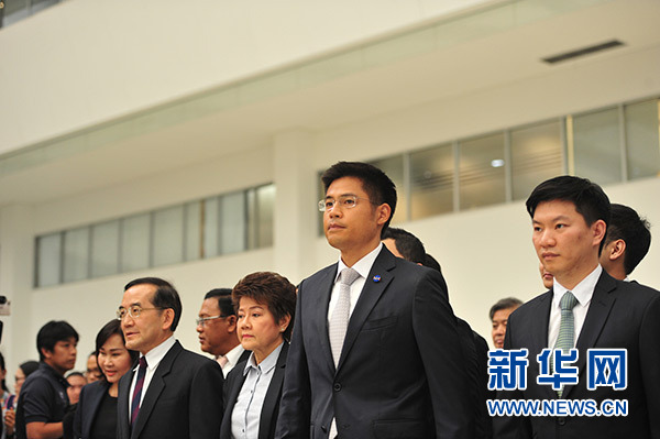 3月7日,在泰國曼谷,泰護國黨黨魁蓬帕尼(中)來到泰國憲法法院。 新華社發(拉亨 攝)