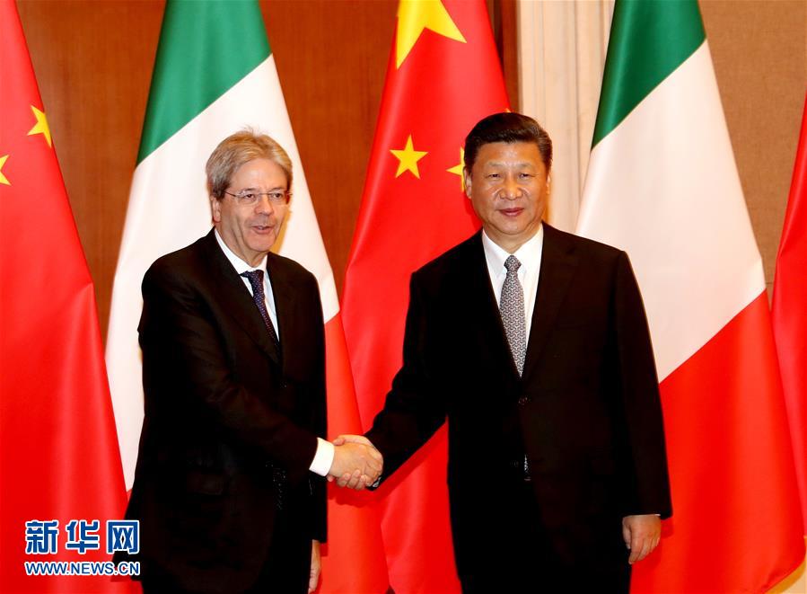 2017年5月16日,習近平在北京釣魚臺國賓館會見來華出席“一帶一路”國際合作高峰論壇的時任意大利總理真蒂洛尼。(新華社記者劉衛兵攝)
