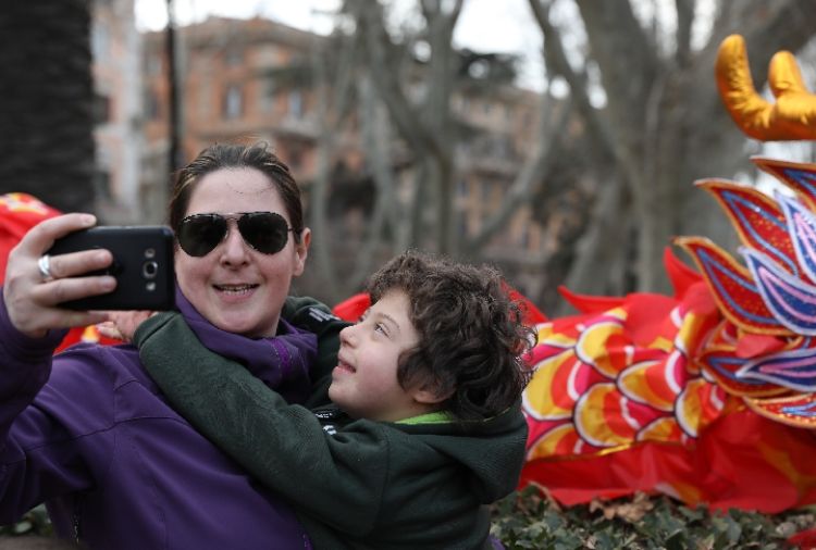 2019年2月10日在意大利羅馬,一對母子在羅馬僑界歡度2019年春節活動上自拍。(新華社記者程婷婷攝)