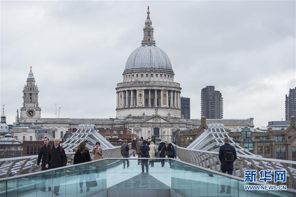 這是3月6日,在英國倫敦,人們從通往倫敦金融城的千禧橋上走過。 新華社發(史蒂芬·程 攝)