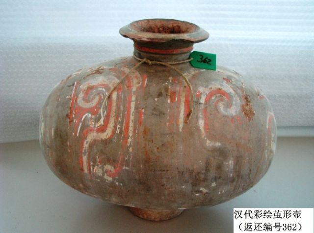 這是漢代彩繪繭形壺(返還編號(hào)362),圖案為對(duì)稱幾何紋。
