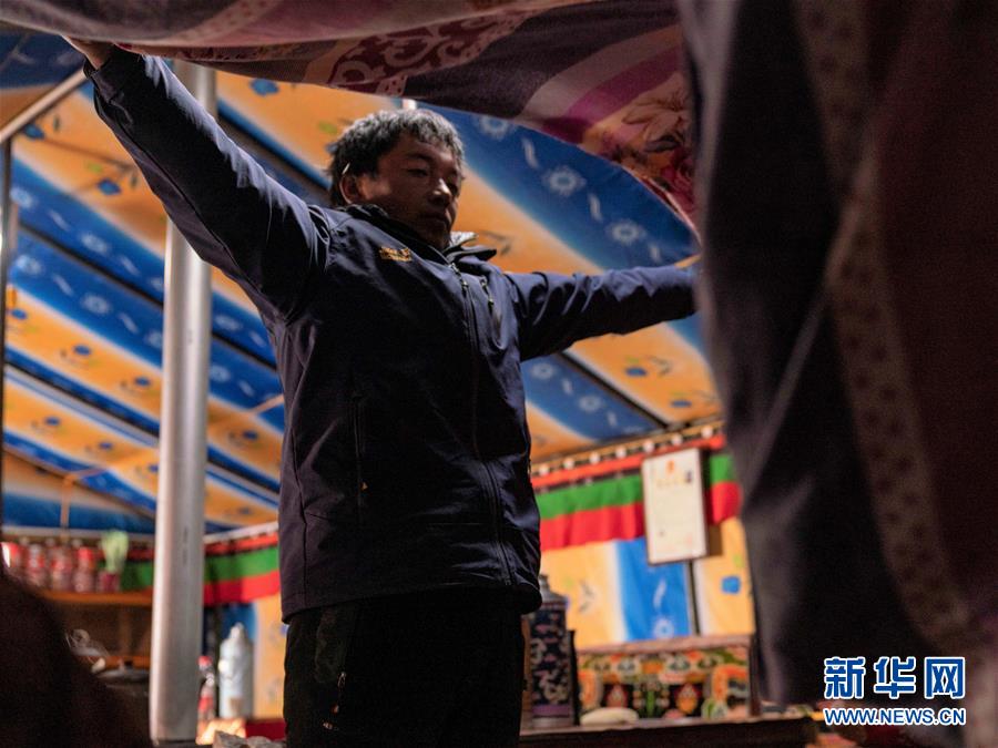 益格在整理帳篷旅館的床鋪(4月28日攝)。新華社發(fā)(孫非 攝)