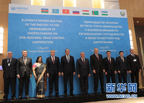 5月3日,在烏茲別克斯坦首都塔什干,來自哈薩克斯坦、吉爾吉斯斯坦、塔吉克斯坦、土庫曼斯坦、烏茲別克斯坦、俄羅斯、阿塞拜疆以及聯(lián)合國毒品和犯罪問題辦公室等的代表會前合影。新華社記者 蔡國棟 攝