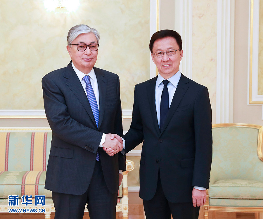 在會見托卡耶夫時,韓正首先轉達了習近平主席對托卡耶夫總統的親切問候。韓正說,在兩國元首的戰略引領和親自推動下,中哈全面戰略伙伴關系快速發展,雙方政治互信日益加深,各領域合作處于歷史最好水平,在地區乃至全世界樹立了睦鄰友好、互利共贏的典范。上個月習近平主席同納扎爾巴耶夫首任總統舉行了富有成果的會晤,向他頒授中華人民共和國“友誼勛章”,向國際社會展現了中哈關系的高水平和特殊性。共建“一帶一路”已成為中哈合作主線,雙方在發展戰略對接、合作機制建設、重大項目推進等方面碩果累累。中方愿與哈方一道,繼續深化絲綢之路經濟帶與“光明之路”新經濟政策對接,以產能、貿易、互聯互通、農業、高技術、金融合作為優先方向,不斷提升中哈合作含金量,更好地造福兩國和兩國人民。中方祝愿哈方順利實施“2050戰略”,在國家發展事業中不斷取得新的輝煌成就。