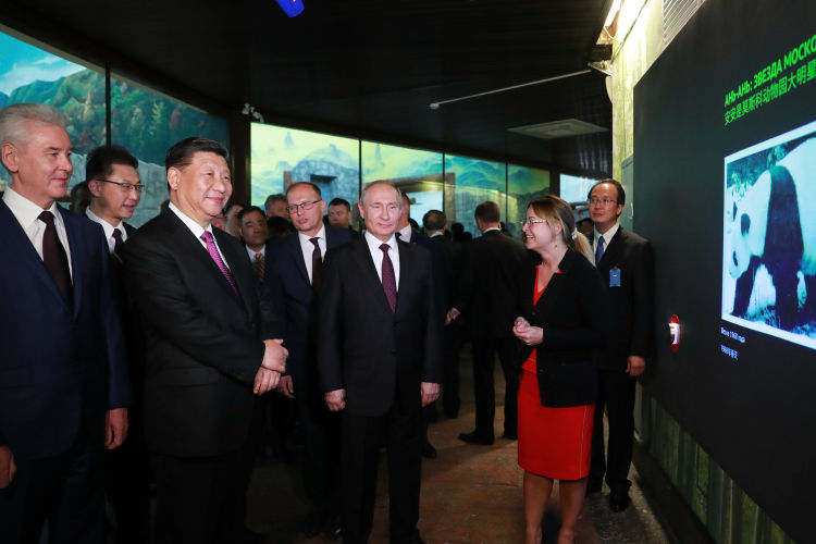 6月5日,國家主席習近平在莫斯科克里姆林宮同俄羅斯總統普京會談。這是會談后,兩國元首共同出席莫斯科動物園熊貓館開館儀式。新華社記者丁林攝