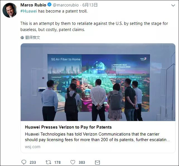 作為美國反華政客中最激進(jìn)最極端的一個(gè)人,盧比奧多次叫嚷中國“偷”美國“知識(shí)產(chǎn)權(quán)”。但是聽到這個(gè)消息后,他立馬撤下了那套“捍衛(wèi)者”的偽裝,給合理維權(quán)的華為扣上“專利流氓”的帽子,還宣稱華為的專利都是“沒有依據(jù)”的。