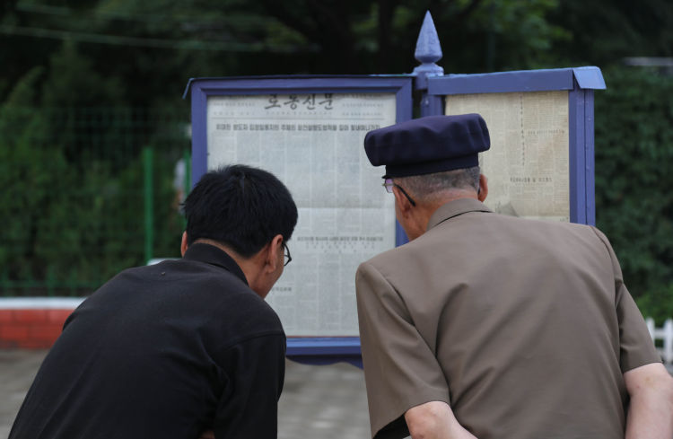 6月19日,在平壤凱旋門附近的一處報紙櫥窗前,市民閱讀習近平總書記在朝鮮主流媒體《勞動新聞》發(fā)表的署名文章。新華社記者江亞平攝