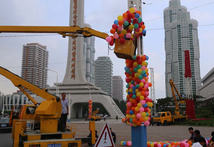 6月19日,當?shù)毓ぷ魅藛T在平壤黎明大街街邊懸掛彩球。新華社記者江亞平攝