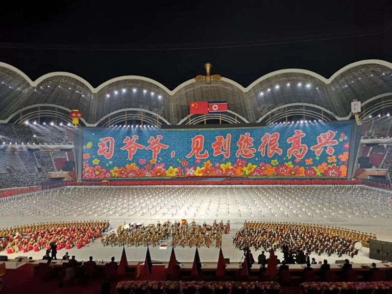 這臺演出為習近平此訪專門精心創作,數萬名朝鮮演員參加表演,朝鮮三大樂團首次同臺獻藝,整場演出氣勢恢宏、震撼感人。
