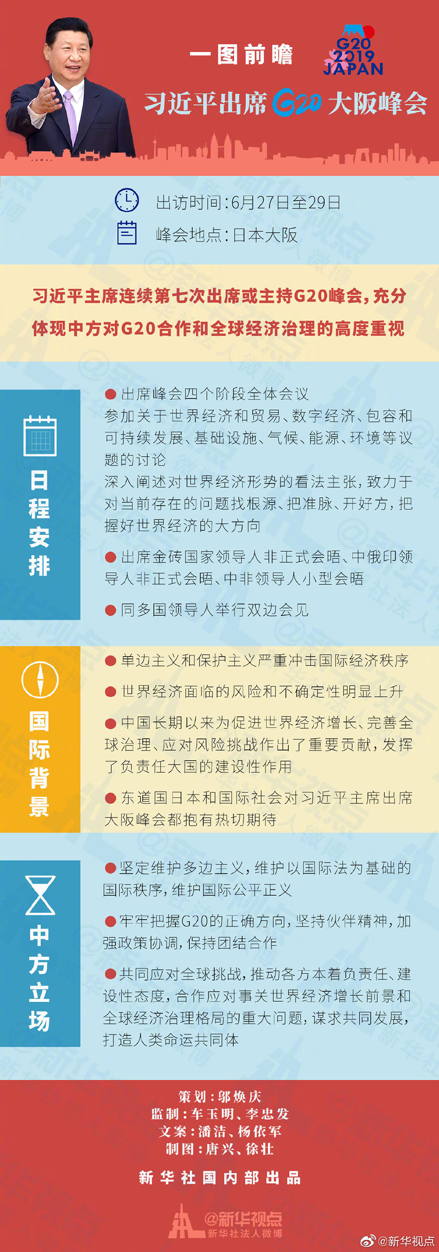 G20大阪峰會上,中方將與各方一道,堅定維護多邊主義,維護以國際法為基礎的國際秩序,維護國際公平正義;牢牢把握G20的正確方向,堅持伙伴精神,加強政策協調,保持團結合作;共同應對全球挑戰,推動各方本著負責任、建設性態度,合作應對事關世界經濟增長前景和全球經濟治理格局的重大問題,謀求共同發展,打造人類命運共同體。