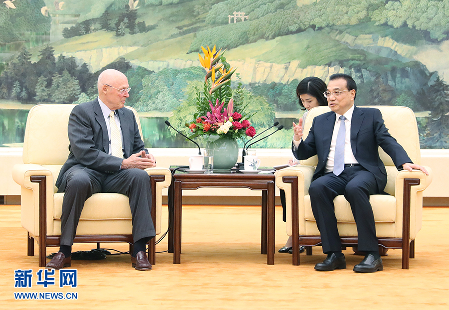 李克強(qiáng)會(huì)見(jiàn)美國(guó)前財(cái)政部長(zhǎng)保爾森