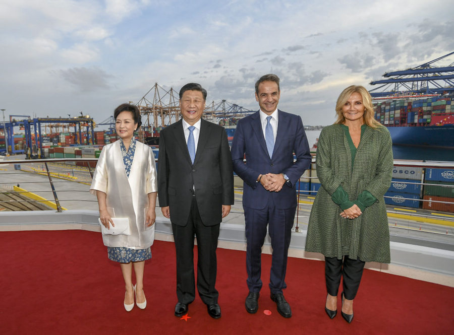 這是習近平和夫人彭麗媛同米佐塔基斯夫婦在港口樓頂平臺合影。新華社記者謝環馳攝