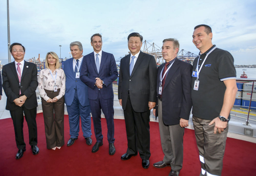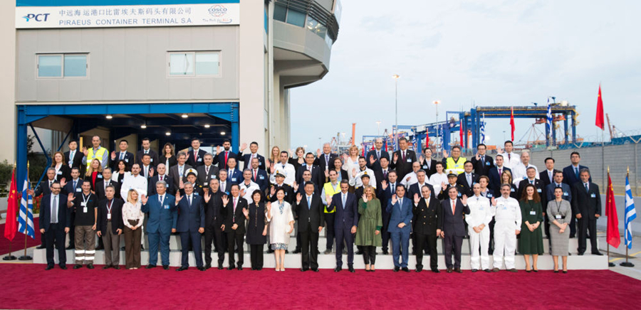 這是習近平夫婦和米佐塔基斯夫婦同中遠當地員工等合影。新華社記者黃敬文攝