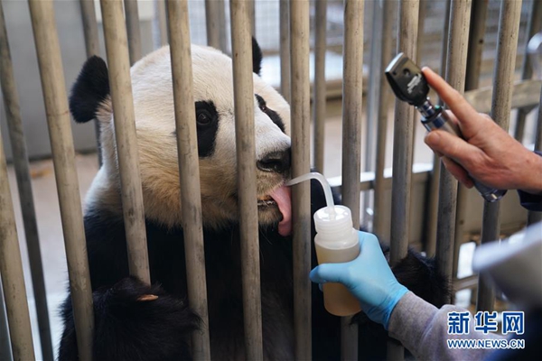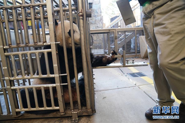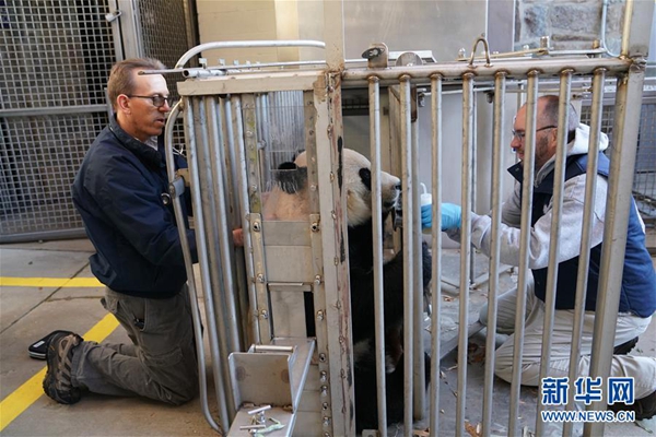 11月13日,在美國華盛頓的美國國家動物園,工作人員在為大熊貓“貝貝”體檢。新華社記者 劉杰 攝