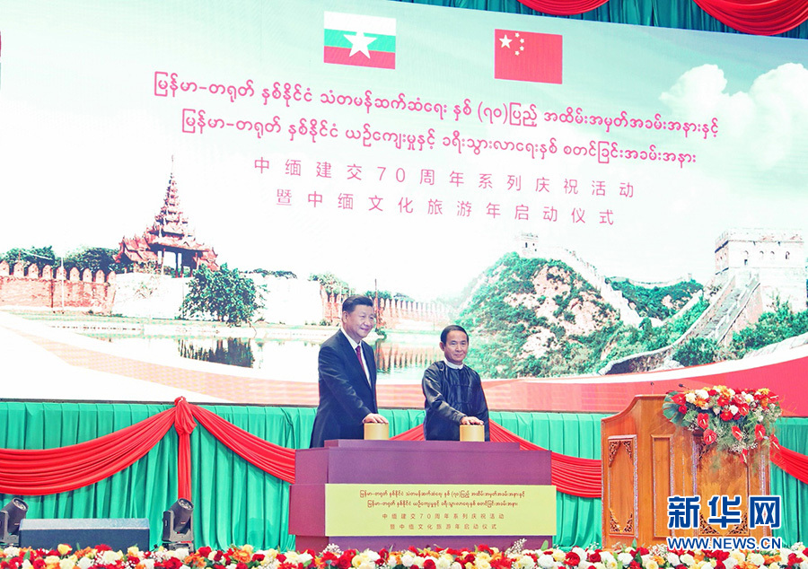 當地時間1月17日晚,國家主席習近平在內比都第二國際會議中心出席中緬建交70周年慶?;顒郁咧芯捨幕糜文陠觾x式。這是習近平和緬甸總統溫敏共同按下按鈕,正式啟動中緬文化旅游年。 新華社記者 鞠鵬 攝
