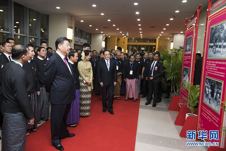 當地時間1月17日晚,國家主席習近平在內比都第二國際會議中心出席中緬建交70周年慶?;顒郁咧芯捨幕糜文陠觾x式。這是儀式開始前,習近平在緬方領導人陪同下,觀看慶祝中緬建交70周年圖片展。 新華社記者 黃敬文 攝