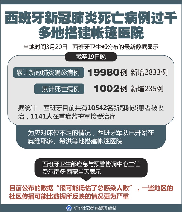 新華社馬德里3月20日電(謝宇智)西班牙衛(wèi)生部20日公布的最新數(shù)據(jù)顯示,截至19日晚,西班牙累計(jì)新冠肺炎確診病例19980例,新增2833例;累計(jì)死亡病例1002例,新增235例。