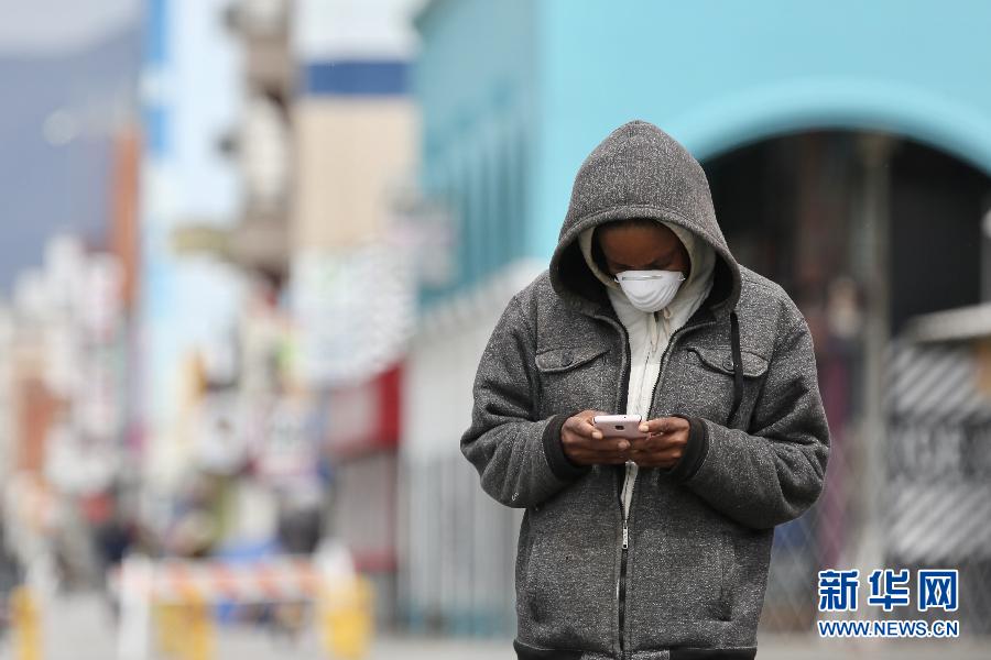 4月10日,一名戴口罩的行人在美國洛杉磯威尼斯海灘看手機(jī)。 為減緩新冠病毒的傳播,洛杉磯市長7日下令,民眾在公共營業(yè)場所要戴口罩或用織物遮擋住臉,這一行政令于2020年4月10日生效。 新華社發(fā)