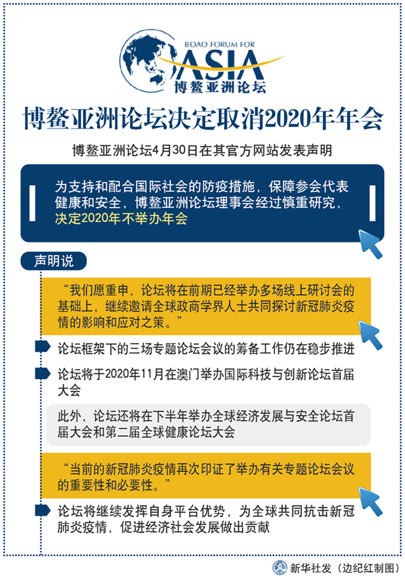 新華社北京4月30日電(記者劉紅霞)博鰲亞洲論壇30日在其官方網站發表聲明,為支持和配合國際社會的防疫措施,保障參會代表健康和安全,博鰲亞洲論壇理事會經過慎重研究,決定2020年不舉辦年會。