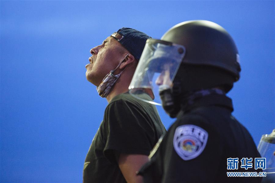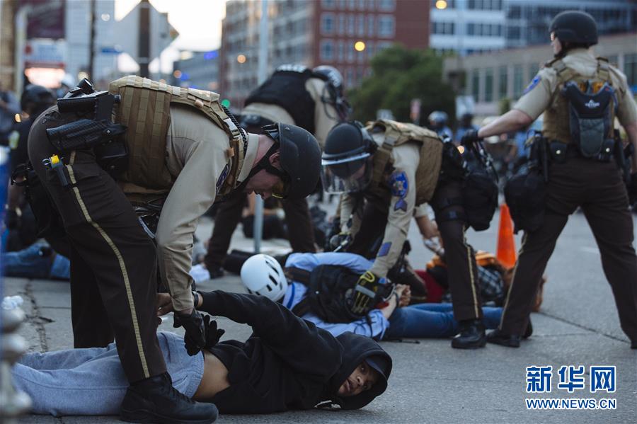 5月31日,在美國明尼蘇達州明尼阿波利斯市,示威者被警察逮捕。 新華社發(安格斯·亞歷山大攝)