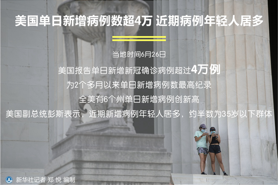 新華社華盛頓6月26日電(記者譚晶晶)美國26日報告單日新增新冠確診病例超過4萬例,為2個多月以來單日新增病例數最高紀錄。全美有6個州單日新增病例創新高。美國副總統彭斯表示,近期新增病例年輕人居多,約半數為35歲以下群體。
