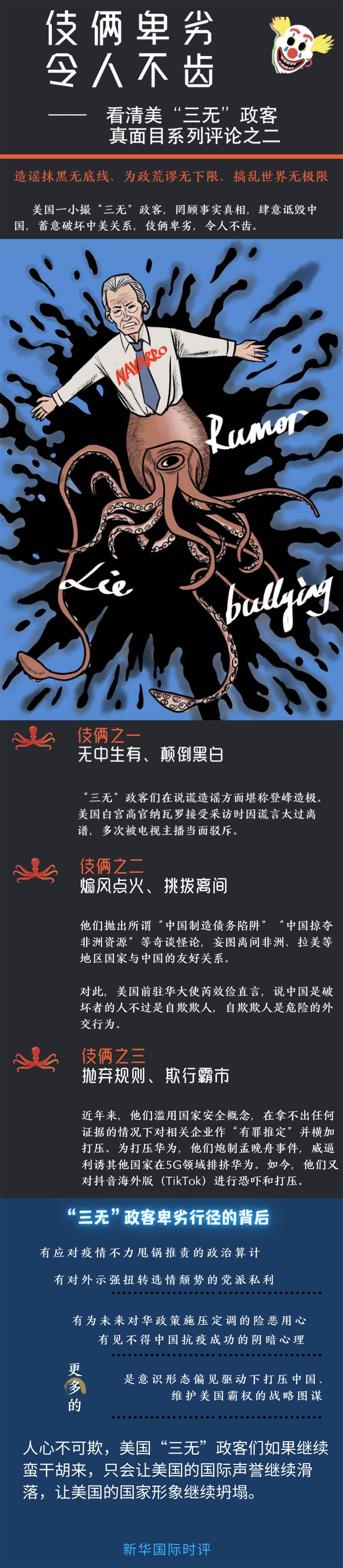 “三無”政客們的伎倆之一是無中生有、顛倒黑白。他們在說謊造謠方面堪稱登峰造極。美國白宮高官納瓦羅接受采訪時因謊言太過離譜,多次被電視主播當面駁斥。為了誣陷“中國政府在新疆侵犯人權”,美國駐華使領館日前在社交媒體上公然配發利用修圖軟件處理過的假圖片。中國外交部發言人指出,這再次證明,美方一些人為了詆毀攻擊中國,已經到了沒有任何下限的地步。