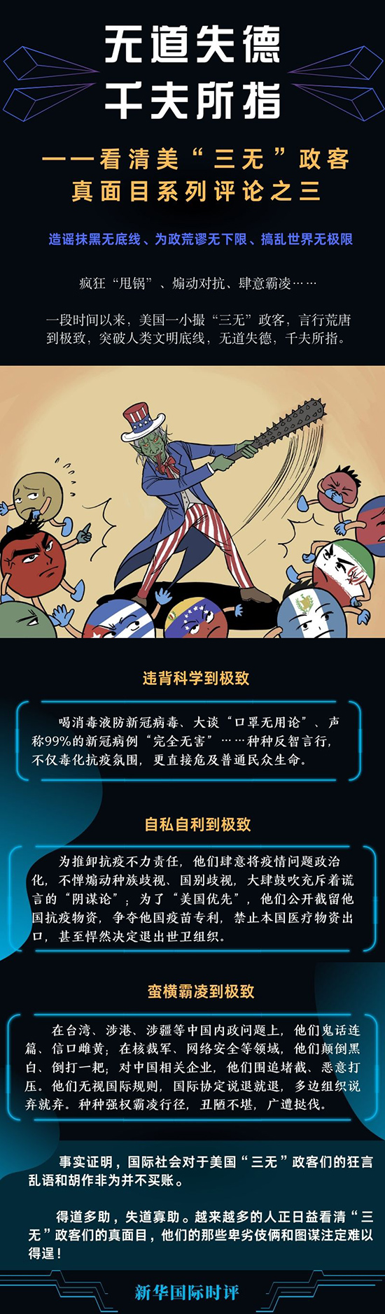瘋狂“甩鍋”、煽動對抗、肆意霸凌……一段時(shí)間以來,美國一小撮造謠抹黑無底線、為政荒謬無下限、搞亂世界無極限的“三無”政客,言行荒唐到極致,突破人類文明底線,無道失德,千夫所指。