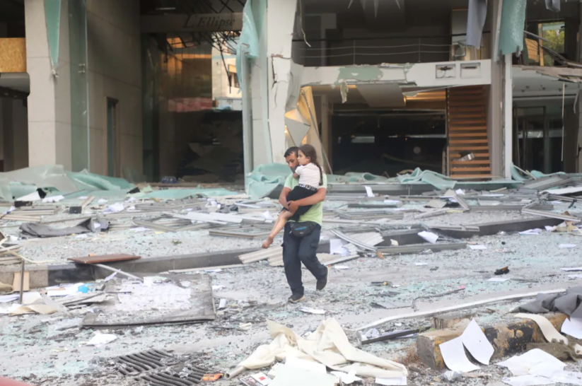 8月4日,在黎巴嫩首都貝魯特,一名男子抱著孩子走過(guò)嚴(yán)重受損的建筑。新華社發(fā)(比拉爾·賈維希攝)