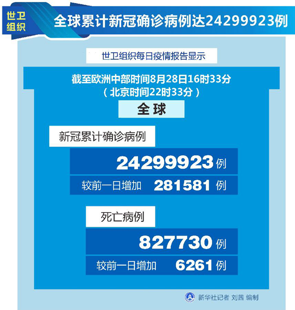 新華社日內(nèi)瓦8月28日電(記者劉曲)世界衛(wèi)生組織28日公布的最新數(shù)據(jù)顯示,全球新冠累計(jì)確診病例達(dá)24299923例。