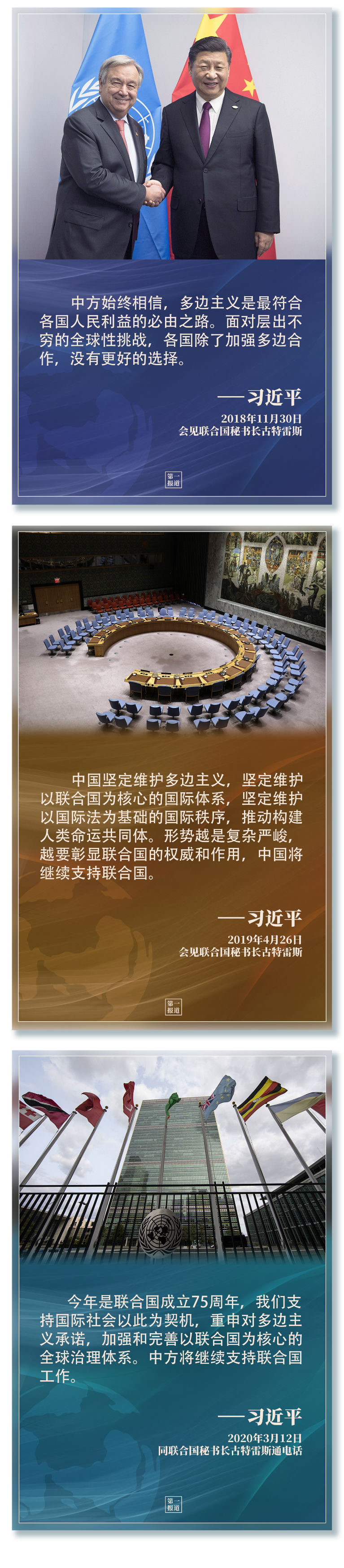 習主席指出,“支持聯合國發揮作用,維護聯合國權威和地位,是中國外交一項基本政策。”2013年以來,習主席多次會見聯合國主要官員,訪問聯合國總部及聯合國專門機構,出席一系列聯合國活動……親自推動中國同聯合國的合作,發出支持聯合國事業、捍衛多邊主義的中國強音。