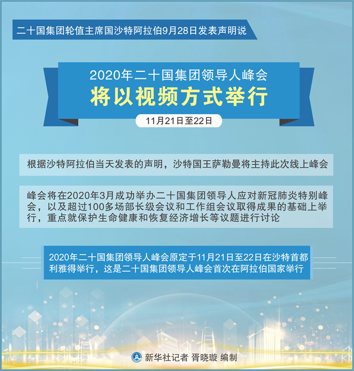 新華社利雅得9月28日電(記者涂一帆)二十國(guó)集團(tuán)輪值主席國(guó)沙特阿拉伯28日發(fā)表聲明說(shuō),今年二十國(guó)集團(tuán)領(lǐng)導(dǎo)人峰會(huì)將于11月21日至22日以視頻方式舉行。