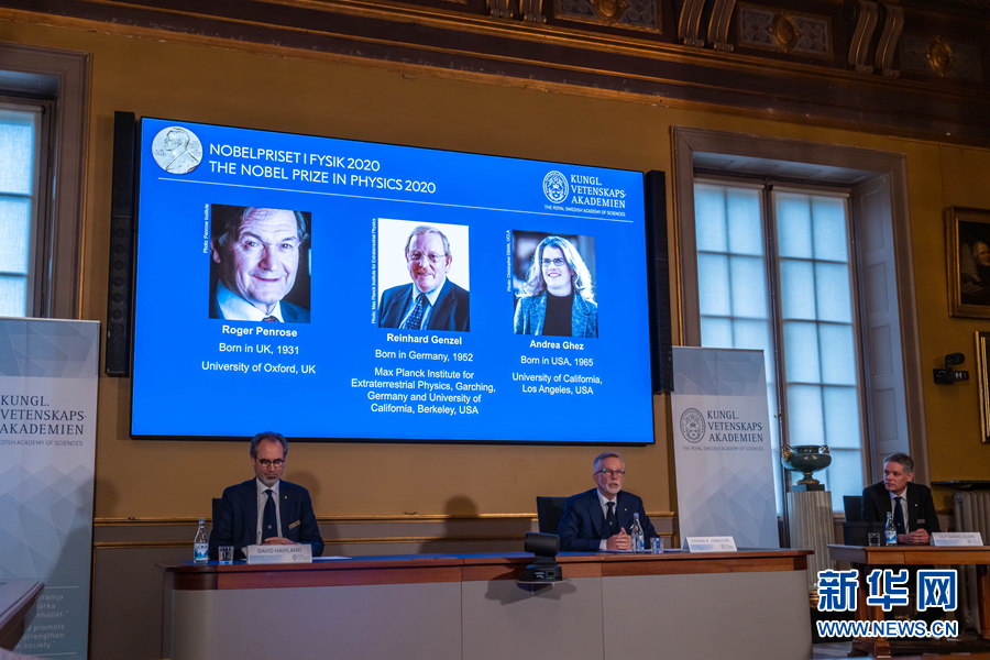 10月6日,在瑞典斯德哥爾摩,瑞典皇家科學院公布2020年諾貝爾物理學獎獲得者。 新華社發(魏學超攝)