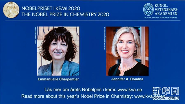 10月7日,在瑞典斯德哥爾摩,瑞典皇家科學院諾獎宣布現場電子屏幕上顯示兩位獲獎的女科學家。新華社發(魏學超 攝)