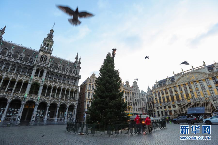 這是11月19日在比利時布魯塞爾大廣場拍攝的圣誕樹安裝現場。