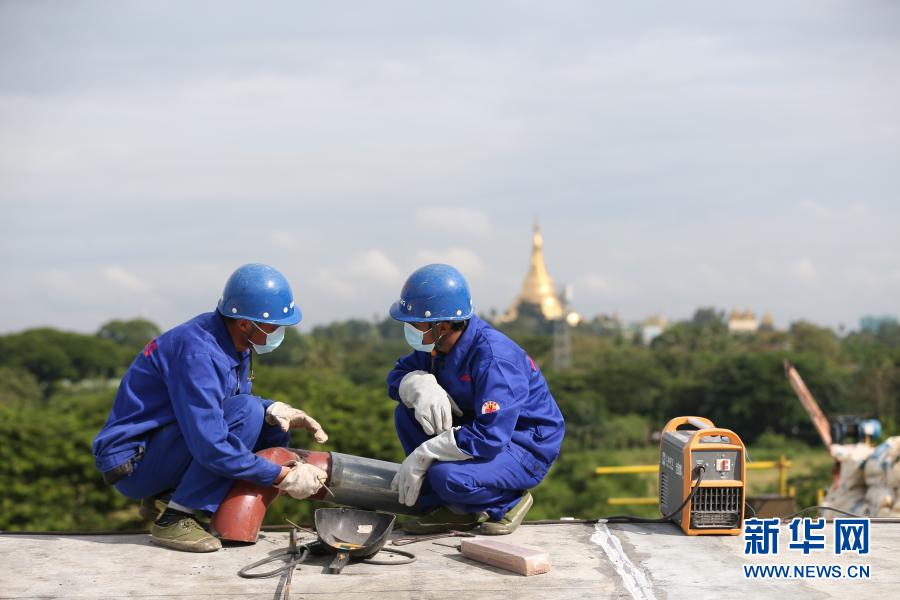 10月28日,在緬甸仰光的國家劇院維修改造項(xiàng)目現(xiàn)場(chǎng),覺泰昂在師父的指導(dǎo)下焊接鋼管。新華社發(fā)(吳昂攝)