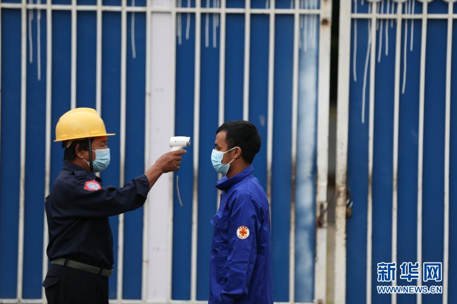 10月28日,在緬甸仰光的國家劇院維修改造項(xiàng)目現(xiàn)場(chǎng),準(zhǔn)備上班的覺泰昂(右)接受體溫測(cè)量。新華社發(fā)(吳昂攝)