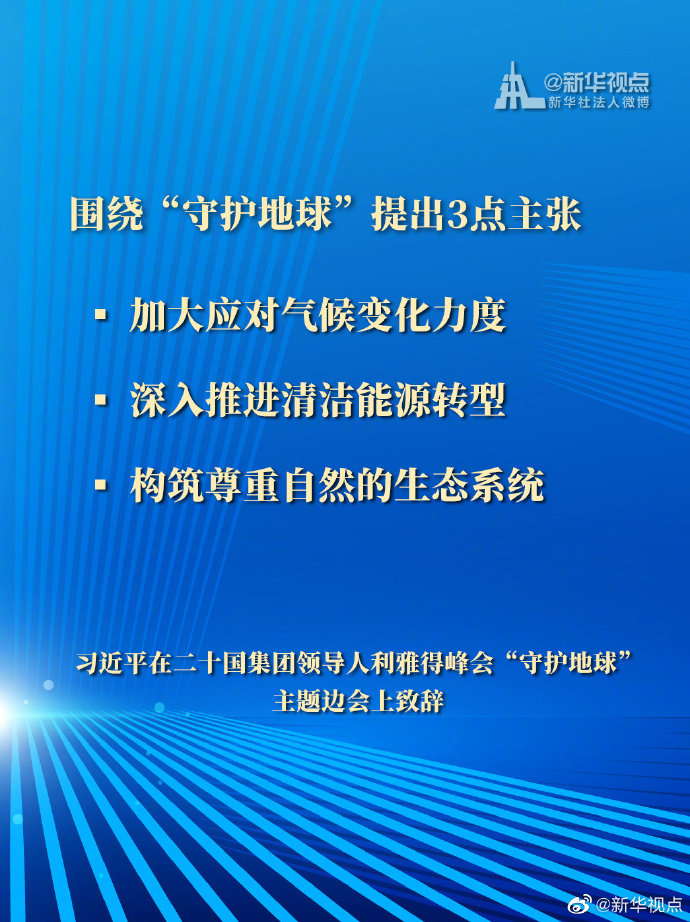 國家主席習(xí)近平11月22日在二十國集團(tuán)領(lǐng)導(dǎo)人利雅得峰會“守護(hù)地球”主題邊會上提出3點(diǎn)主張。