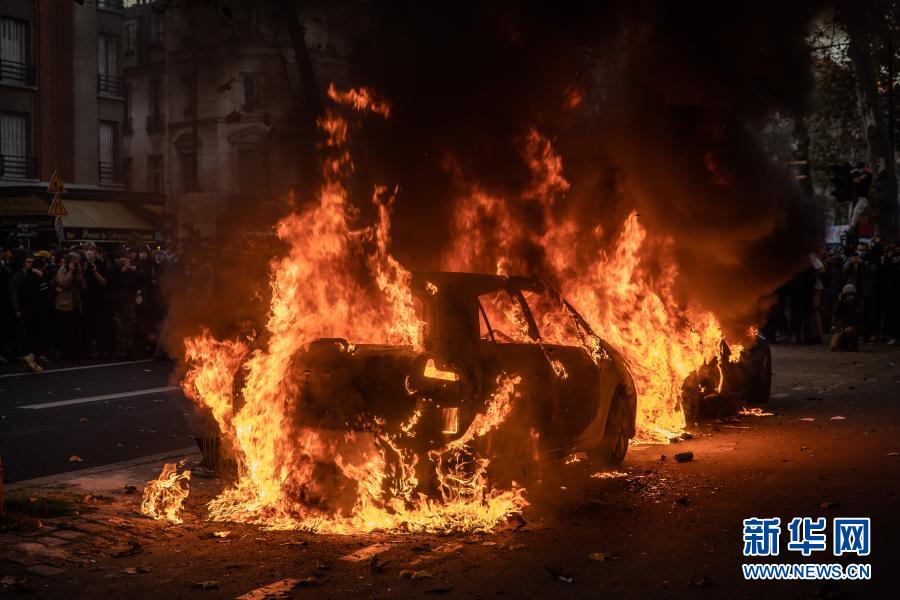 這是11月28日在法國巴黎拍攝的游行示威中被點燃的車輛。