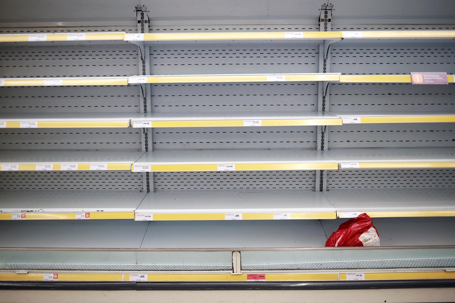 這是12月21日在英國(guó)倫敦一家商店拍攝的貨架上最后一袋火雞。(新華社/路透)