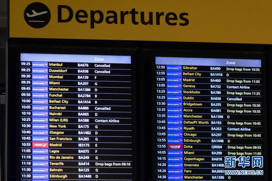 12月21日,英國倫敦希思羅機場第五航站樓內顯示多趟航班被取消。新華社發(蒂姆·愛爾蘭攝)
