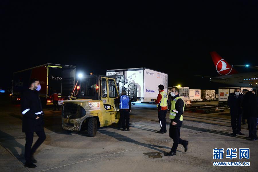 12月30日,在土耳其安卡拉的埃森博阿機場,工作人員從飛機上搬運中國科興公司生產(chǎn)的新冠疫苗。新華社發(fā)(穆斯塔法·卡亞攝)