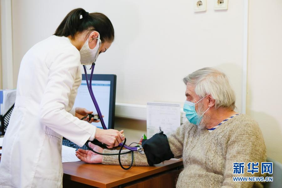12月30日,在俄羅斯首都莫斯科,醫護人員在進行疫苗接種前為一名老人測量體溫。新華社發(亞歷山大攝)