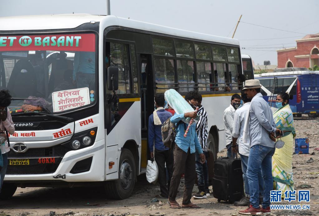 5月5日,印度比哈爾邦宣布實施封鎖措施后,人們在印度巴特那汽車站準備乘坐巴士返回家鄉。