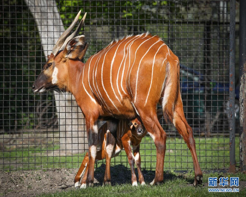 5月10日,兩周大的幼年山地紫羚與母親一起在波蘭首都華沙的華沙動物園的籠舍中散步。