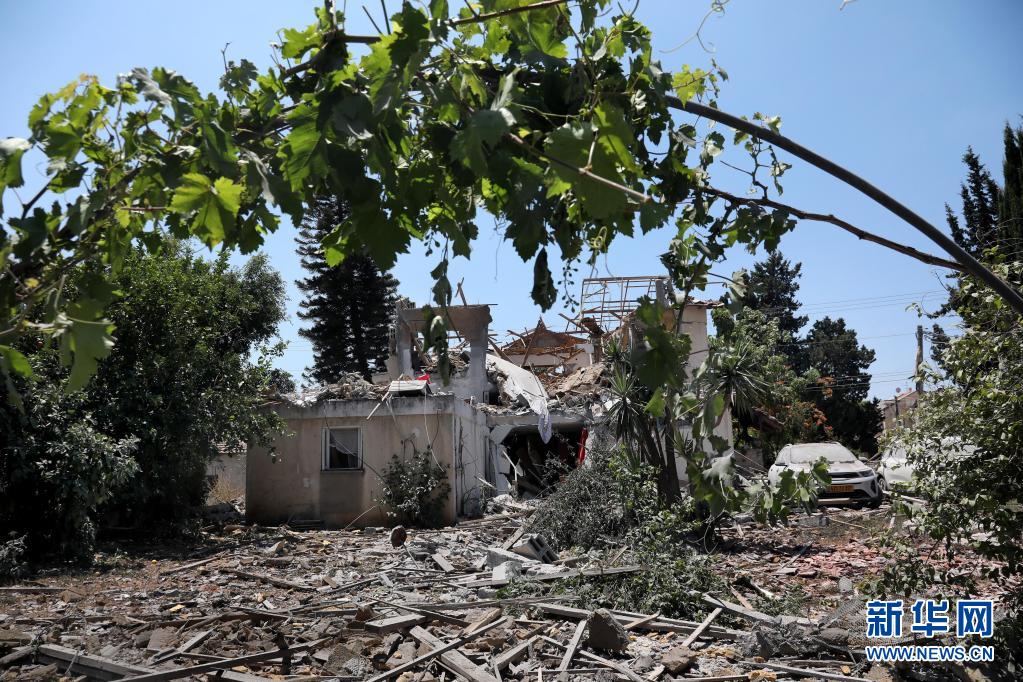 這是5月13日在以色列中部城市耶胡德拍攝的被火箭彈擊中損毀的房屋。