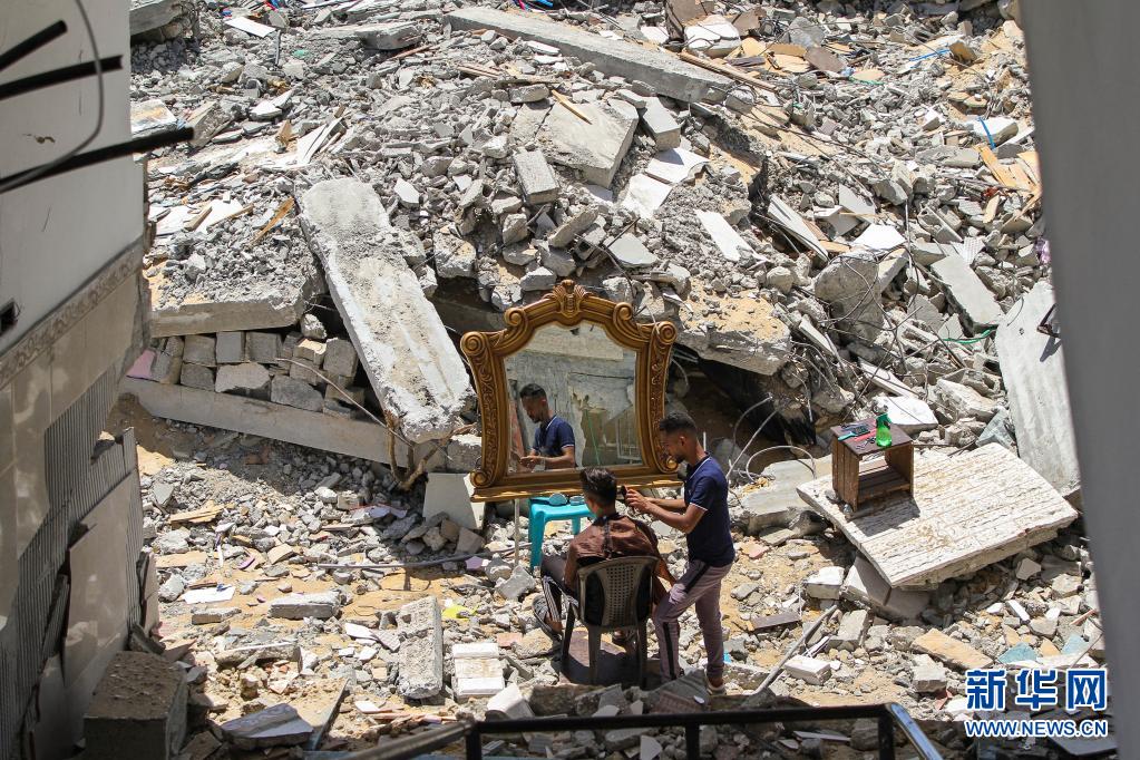 5月26日,在加沙地帶北部的城鎮貝特拉希亞,23歲的巴勒斯坦理發師阿卜杜拉·扎瓦拉在他被以色列炸毀的房屋前為顧客免費服務。 新華社發(里澤克·阿卜杜勒·賈瓦德攝)
