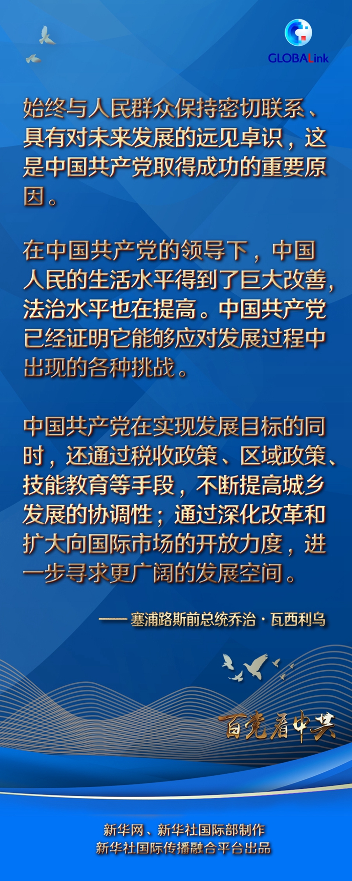瓦西利烏認為,始終與人民群眾保持密切聯系、具有對未來發展的遠見卓識,這是中國共產黨取得成功的重要原因。他表示,中國共產黨有能力制定最適合國情的政策,同時有效地與腐敗現象作斗爭,帶領國家不斷前進。