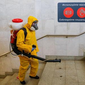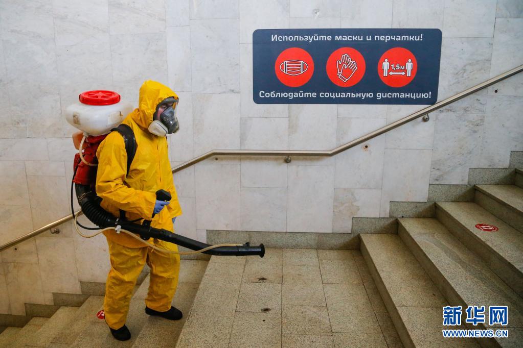 6月24日,工作人員身著防護服在俄羅斯莫斯科一個火車站進行消毒作業(yè)。
