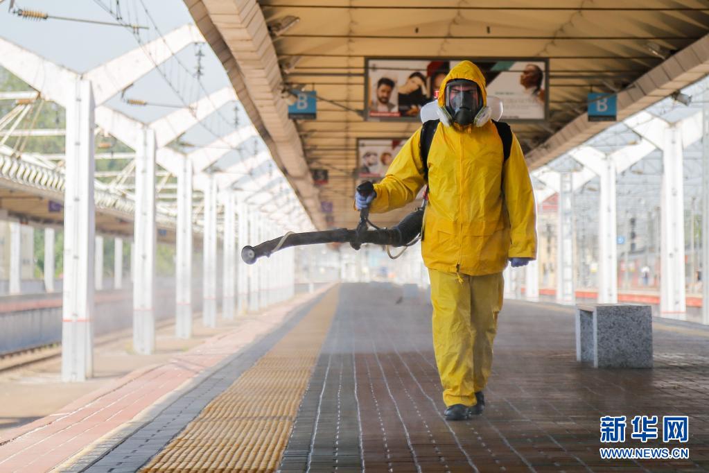 6月24日,工作人員身著防護(hù)服在俄羅斯莫斯科一個(gè)火車站進(jìn)行消毒作業(yè)。